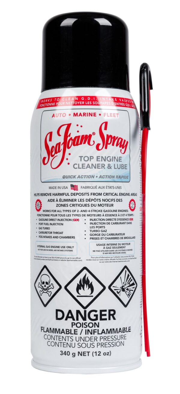 Use Sea Foam Spray to clean harmful engine deposits where fuel cleaners can’t reach. Works fast to clean intake valves & chamber areas. Safely cleans & lubricates critical upper engine parts. Important for modern Gasoline Direct Injection (GDI) engines where fuel cleaners can’t reach the intake valves. Use Sea Foam Spray to fog intakes & spray cylinder cavities. Lubricates & protects chamber parts from dry out & corrosion.